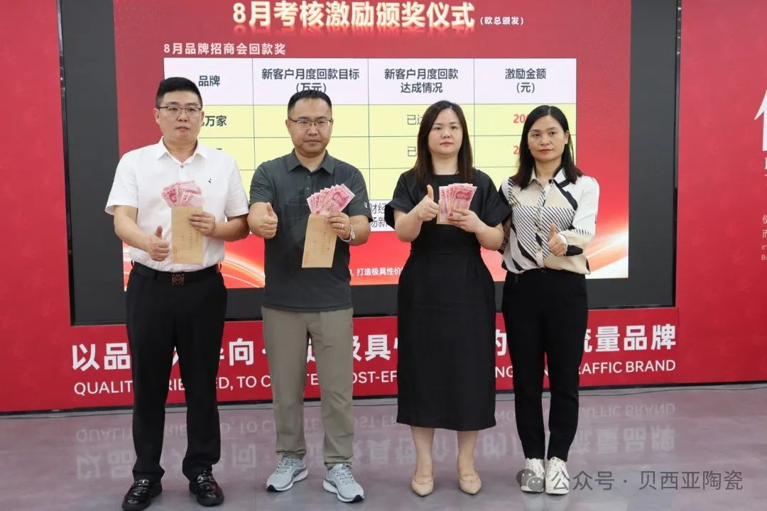對標先進添干勁,凝聚合力謀發(fā)展。成績的取得離不開全體銷售人員的辛勤付出和團隊的緊密協(xié)作。會議上,對8月優(yōu)秀個人及團隊進行了表彰并現(xiàn)場發(fā)放現(xiàn)金獎勵。表彰先進,樹立標桿,激揚著大家汲取榜樣力量,凝聚起上下同心、決戰(zhàn)決勝強大合力,為品牌的發(fā)展作出新的更大貢獻。